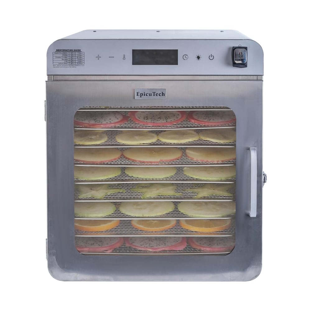 Der EpicuTech Dörrautomat bietet eine enorme 1,41 m² Trocknungsfläche mit 10 Edelstahltabletts. Seine 800W Leistung und der digitale Touchscreen bieten präzise Kontrolle über Temperatur (bis zu 90°C) und Zeit (24-Stunden-Timer).